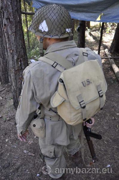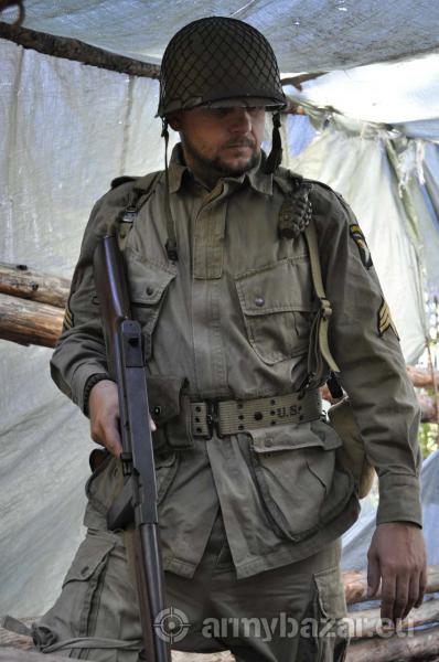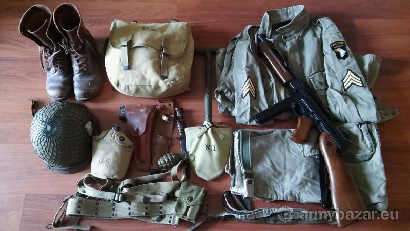Beschreibung: Predám komplet súpravu vojaka jednotky 101st Airborne Division z 1942-45 (WWII). Uniforma veľkosť XL (175-185cm, 90-100kg) Boty - 43-44 Výstroj: prilba, opasok, nosný systém, brašňa, lopatka, polna flaša, puzdro na pištol a zasobniky, nôž USMC s puzdrom WWII, dekoracia granátu, Zbraň/airsoft: Thomson ACM SW M1A1 Full metal + 1 zásobník (400BB)